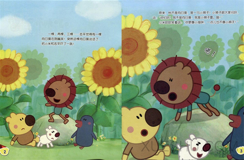 原来,他不是向日葵,是一只小狮子!小狮子跟大家问好,说:“你们好我不是向日葵,我是小狮子雷。喵!”小米哈哈笑着说:“你更像小猫咪,一一点儿也不像小狮子!一棵、两棵、三棵.志平觉得有一棵向日葵在咧嘴笑!突然这棵向日葵说话了,把小米和志平吓了一-跳!