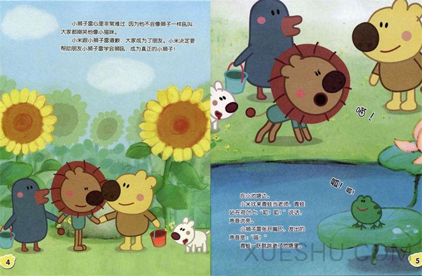 小狮子雷心里非常难过因为他不会像狮子- -样吼叫,大家都嘲笑他像小猫咪。小米跟小狮子雷道歉,大家成为了朋友。小米决定要帮助朋友小狮子雷学会狮吼,成为真正的小狮子!在小池塘边,小来找来青蛙当老师,青蛙站在荷叶上呱呱的说话,声音洪亮。小狮子雷张开嘴巴。发出的声音是:喵,青蛙一跃就跳进场池塘里。